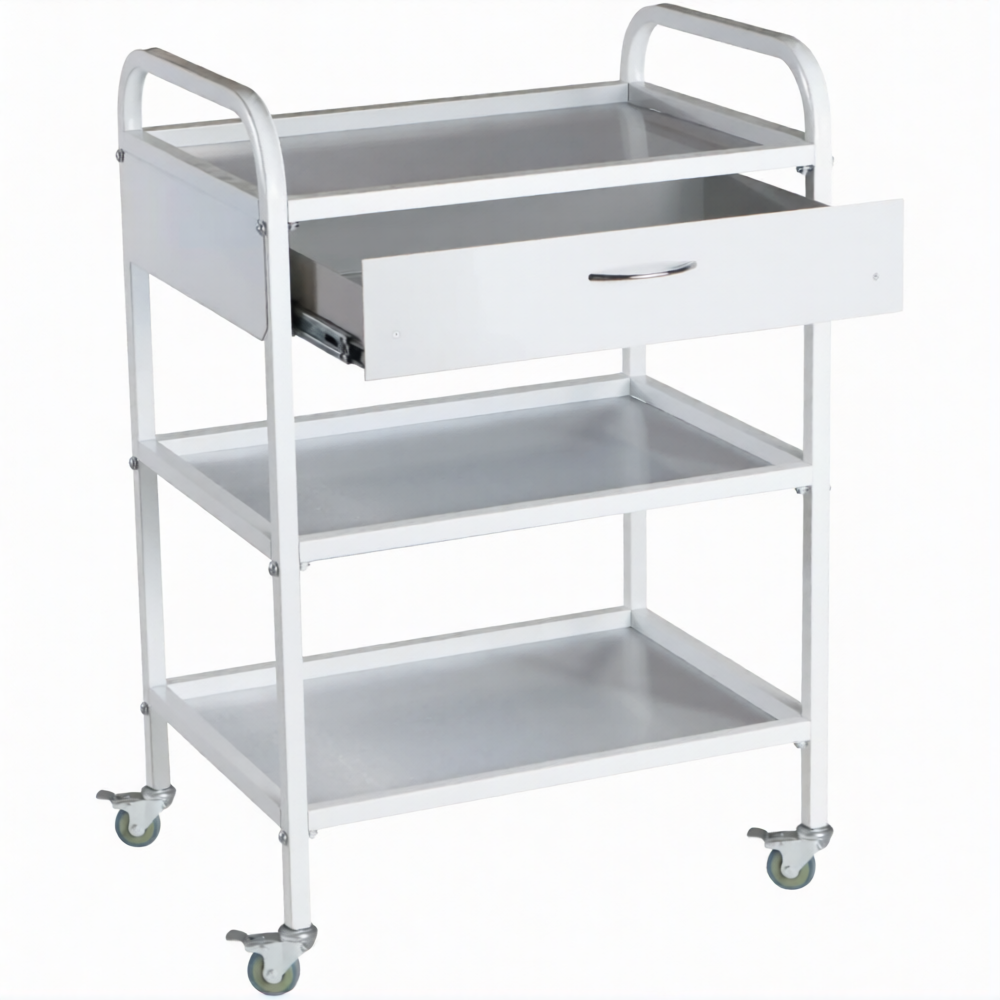 Стол медицинский инструментальный СМИ-03-01 (полки нерж., колёса серая резина) предназначен для размещения инструмента, лекарственных препаратов и приборов.