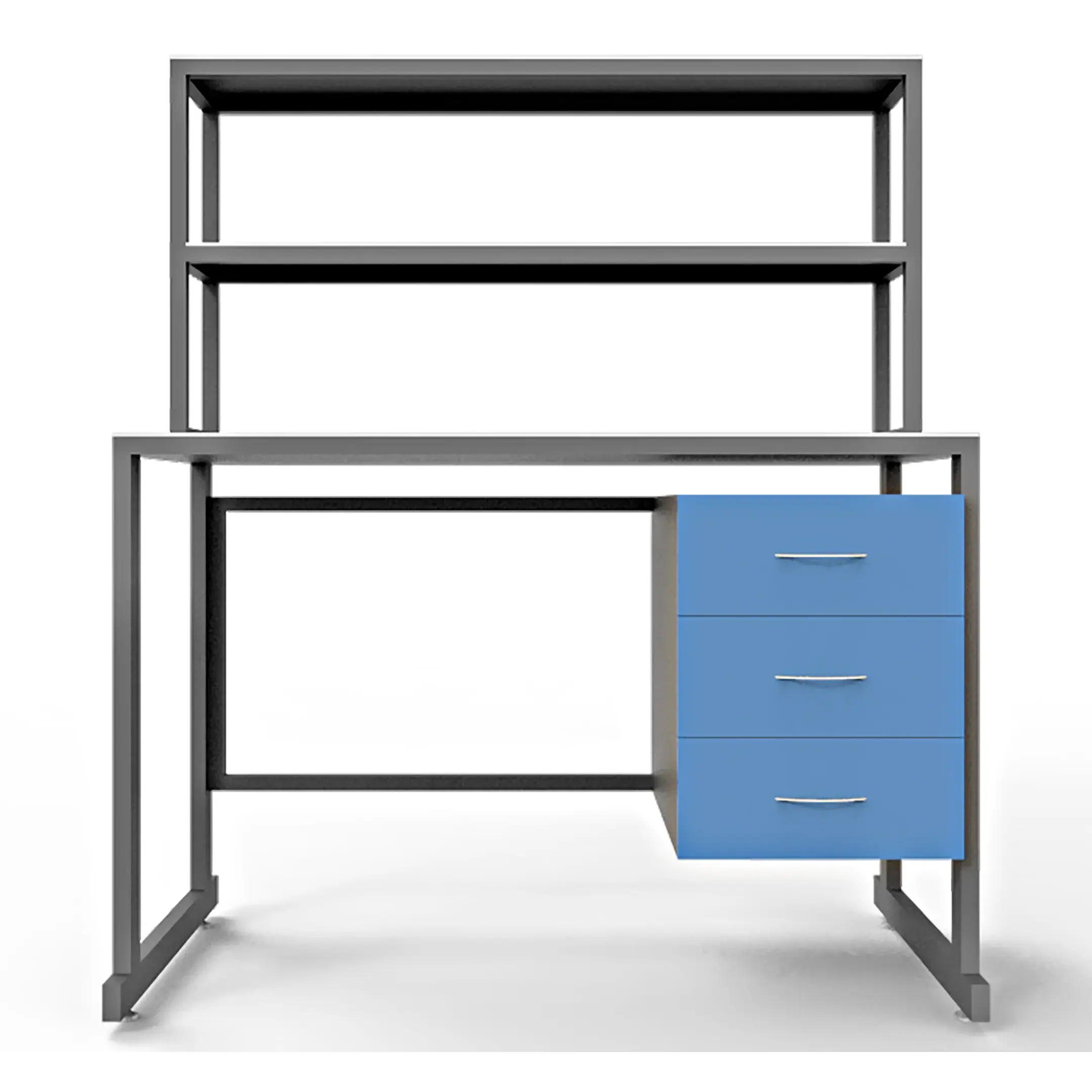 - Удобная система хранения — тумба под столешницей с тремя выдвижными ящиками и надстройка с двумя полками для хранения материалов и инструментов.