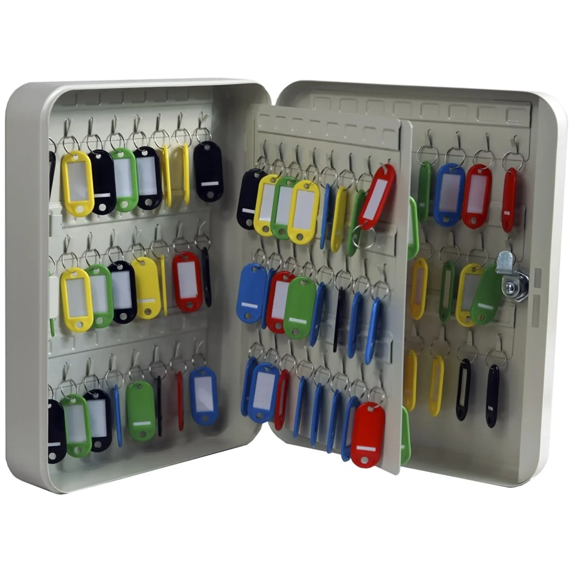 - Высокая вместимость для управления крупным ключевым хозяйством — шкаф рассчитан на хранение 96 ключей, что делает его идеальным выбором для объектов с большим количеством помещений, номеров, точек доступа или транспортных средств. Он позволяет сосредоточить контроль над всем комплексом ключей в одном защищенном месте.