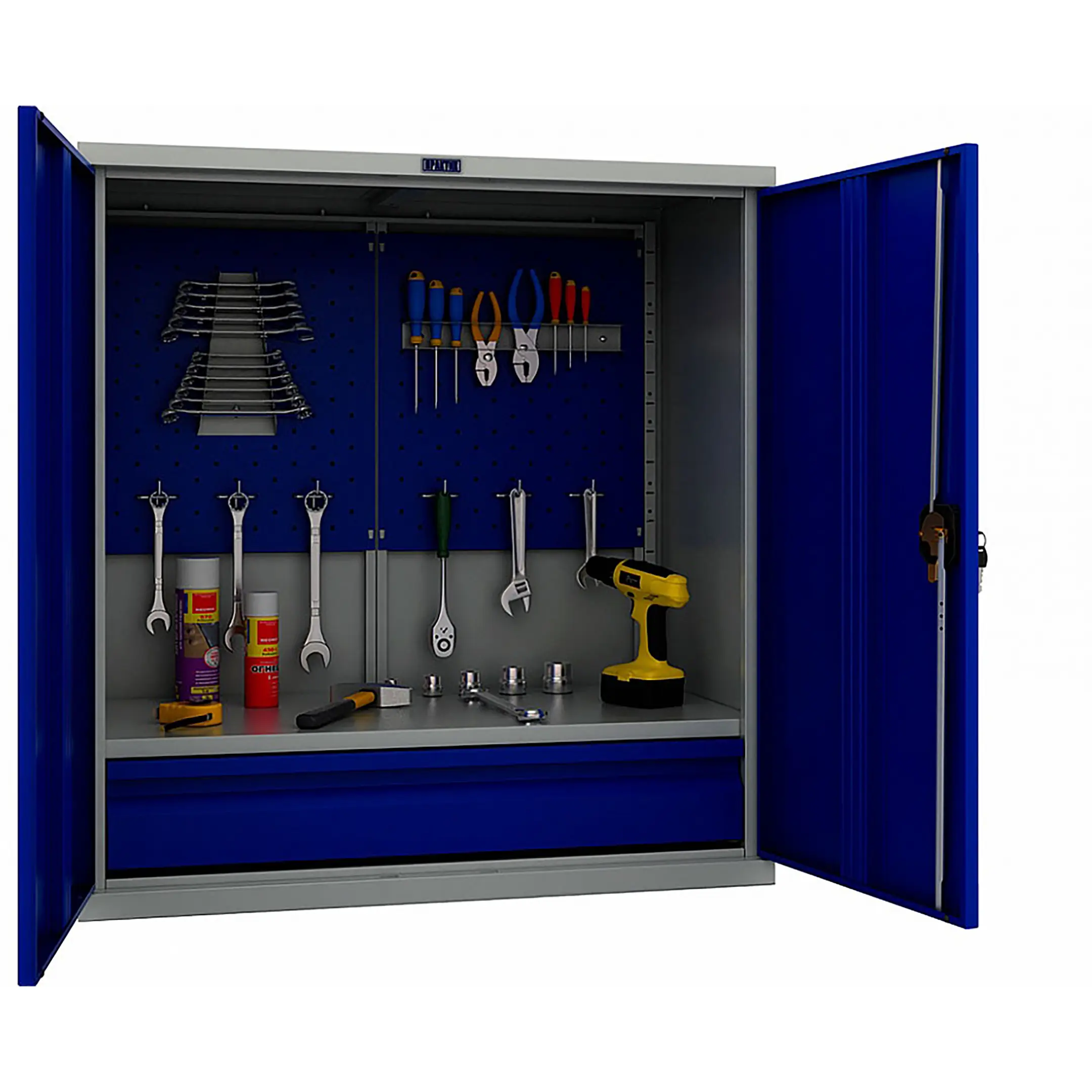 - Оптимизированная организация и максимальная вместимость — шкаф спроектирован для эффективного использования пространства. Комбинация выдвижных ящиков разной высоты и отделений с полками позволяет рассортировать инструмент и оборудование любого размера и веса: от мелких сверл и метизов до крупных электроинструментов и измерительных приборов. Каждому предмету находится свое логичное место.