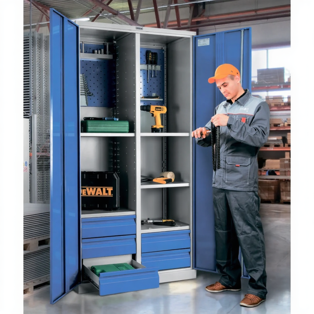 - Надежная защита инструментального парка — цельнометаллический корпус с запирающимися на общий замок дверями обеспечивает высокий уровень безопасности. Это защищает содержимое от краж, несанкционированного доступа, а также от пыли, грязи, стружки и влаги, характерных для производственной среды.
