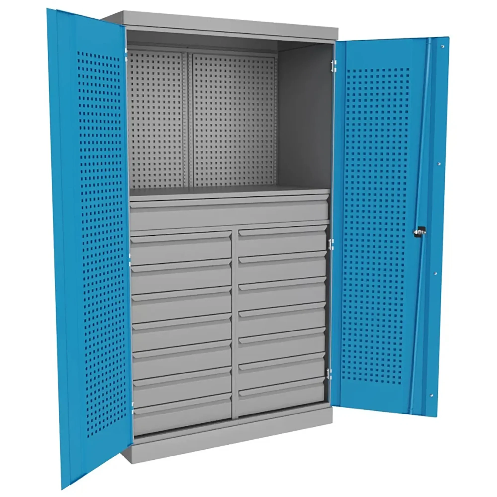 - Надежная защита дорогостоящего инструментального парка — цельнометаллический корпус с запирающимися на общий замок дверями обеспечивает высочайший уровень безопасности, защищая содержимое от краж и несанкционированного доступа. Конструкция также оберегает инструмент от агрессивных факторов цеховой среды: пыли, стружки, масел и влаги.