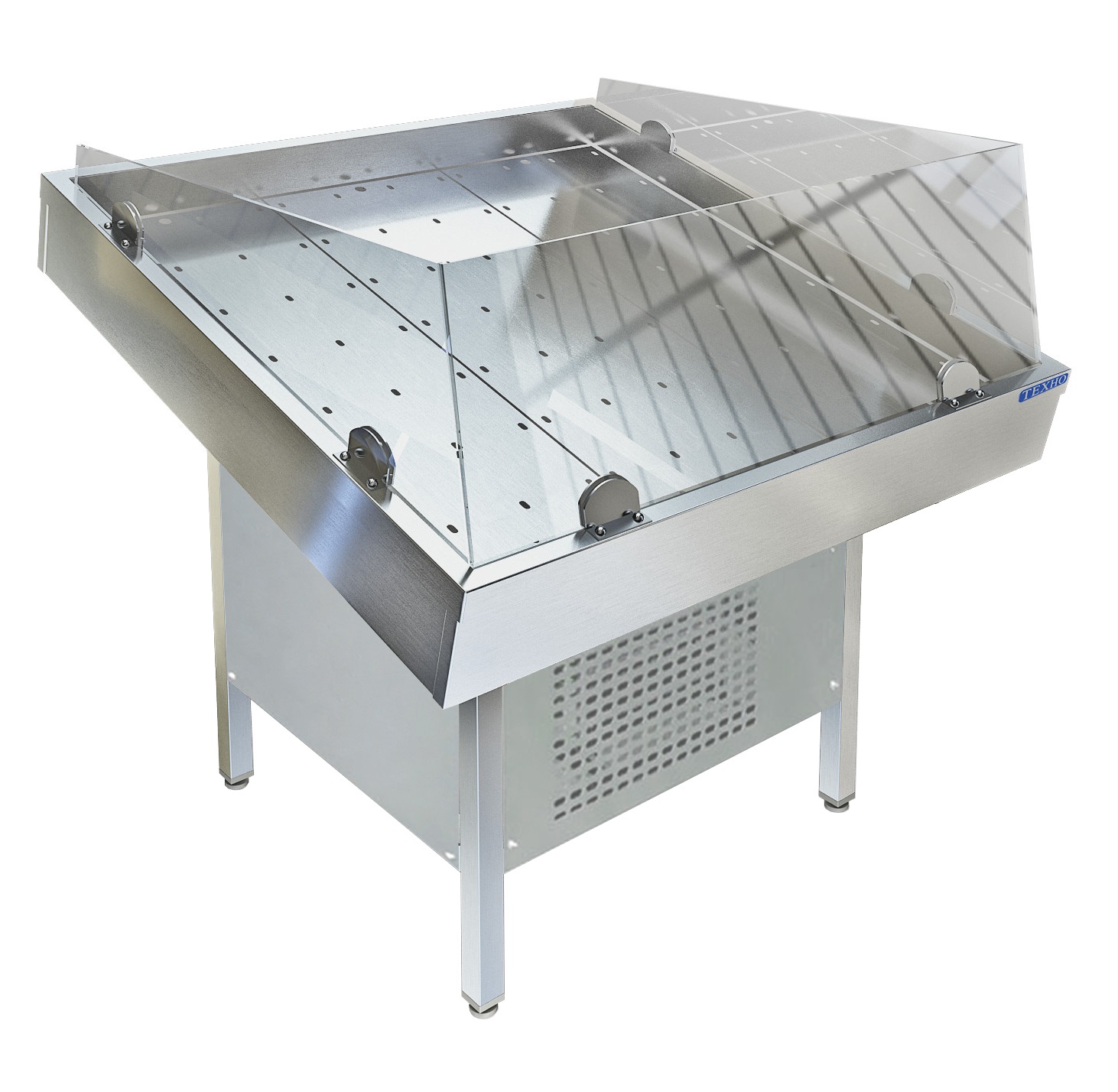 Особенности Фартук с 3-х сторон. Стекло с 3-х сторон. Ванна из нержавеющей стали марки AISI 304 толщиной 1,0 мм. Панели обшивки из нержавеющей стали марки AISI 430 толщиной 0,8мм. Сливные трубки диаметром 20 мм 2шт. Внутри ванны перфорированный поддон из нержавеющей стали марки AISI 304 толщиной 0,8мм для аккумулирования холода. Подставка сварная из трубы 40х40 нержавеющей стали марки AISI 304. Регулируемые опоры. Агрегат АСС (Италия), мощность 500 Вт. Стол поставляется в собранном виде. Описание Витрины для рыбы на льду предназначены для размещения, охлаждения и демонстрации свежей рыбы и других морепродуктов. Стол «Рыба на льду» состоит из ванны для льда и подставки под нее. Витрина изготавливается с принудительным охлаждением и без него. К дополнительным опциям относятся: установка стекла, фартук с 3-х сторон, установка на колеса, форма для отбортовки льда, держатель для пакетов, накладные ступеньки для выкладки различных сортов рыбы, накладка соединяющая два стола.