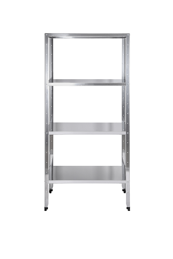 На четырех уровнях стеллажа Luxstahl СР-1800х900х400/4 размещаются упакованные продукты питания (ингредиенты), полуфабрикаты, специи, поварская посуда и инвентарь.