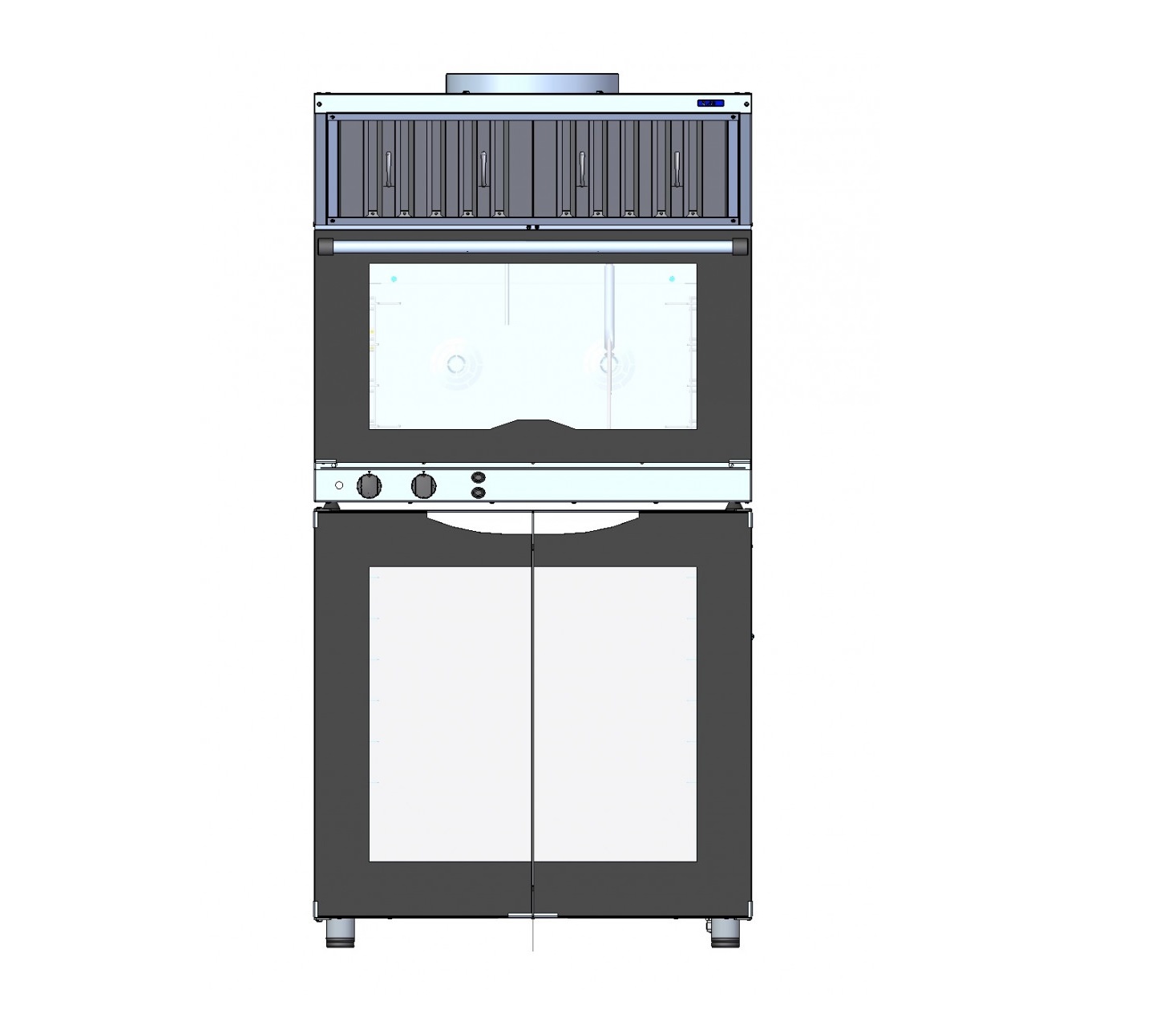 Зонт фиксируется с помощью уголков и болтов М5 к задней стенке конвекционной печи (предварительно нужно совместить трубку вывода пара с приемной трубой зонта и соединить их резиновым патрубком и хомутами).