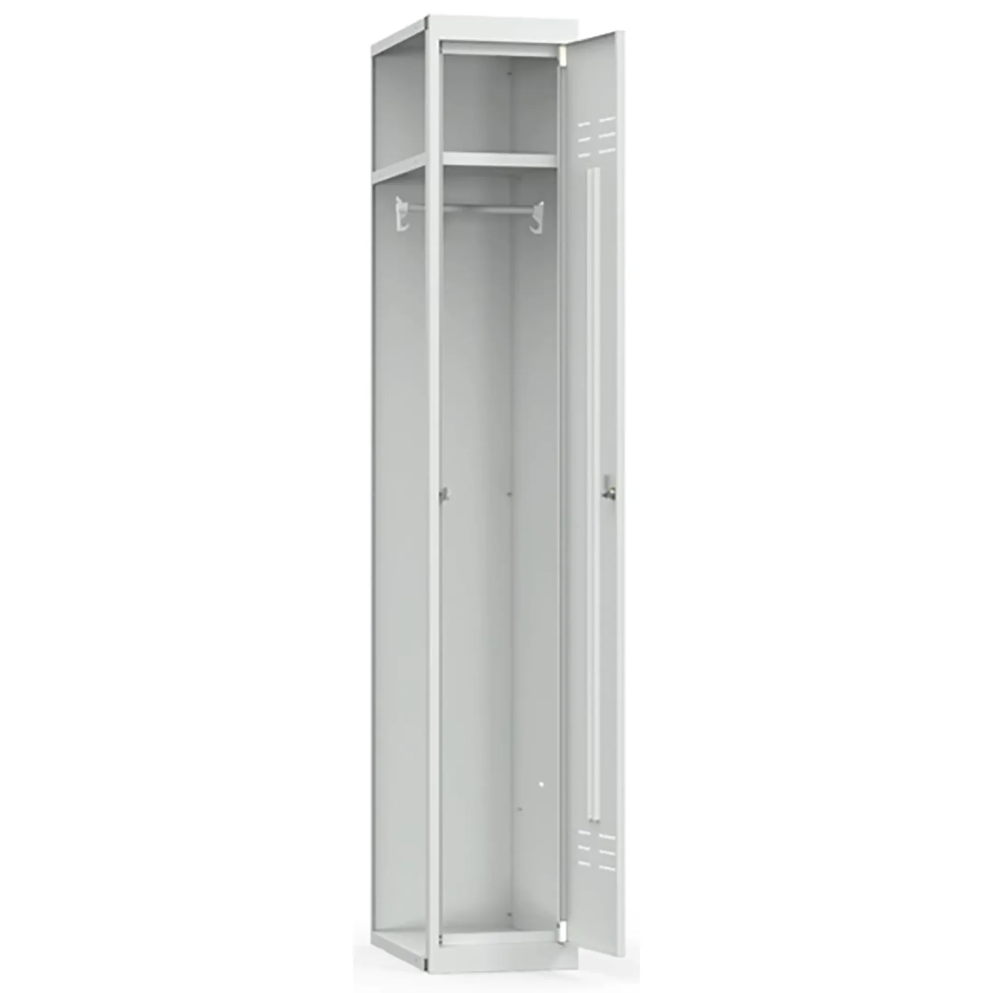 • Односекционный металлический шкаф для одежды имеет полную внутреннюю комплектацию: полку для головных уборов, пластиковые перекладины для вешалок и два крючка для одежды, проушина для навесных замков;