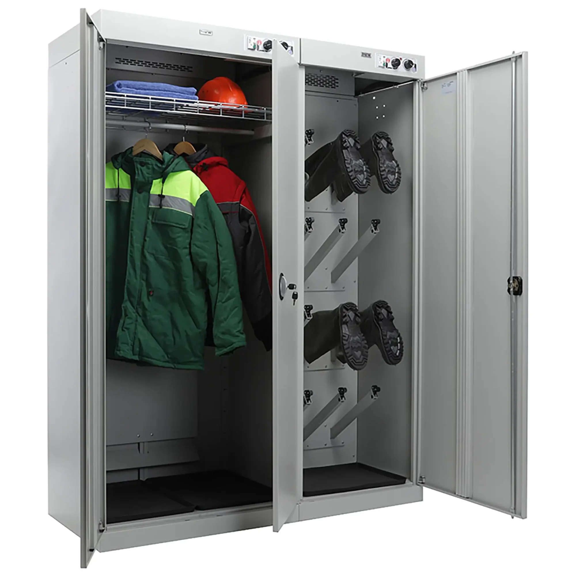 - Универсальность применения — шкаф подходит для сушки различных типов изделий: рабочей и спортивной одежды, спецодежды, обуви, полотенец и инвентаря, что делает его многофункциональным решением для разных сфер деятельности.